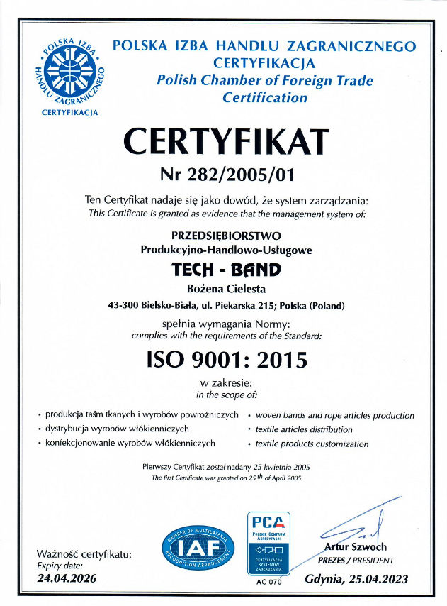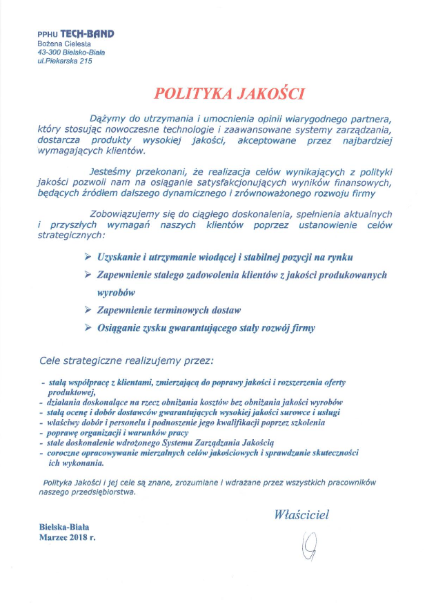 P.P.H.U "TECH-BAND" Bozena Cielesta została założona w 1994 roku. Do tej pory firma ma duże doświadczenie w produkcji technicznych produktów z włókien.
